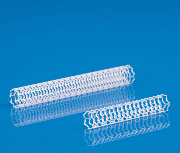 生物可吸收冠脈雷帕霉素洗脫支架系統(tǒng)由球囊擴(kuò)張型可吸收冠脈支架、藥物涂層和輸送系統(tǒng)組成,通過把可降解聚乳酸粒子經(jīng)過高溫熔融制成精密聚乳酸管材,將聚乳酸管材利用飛秒激光按照專業(yè)的設(shè)計(jì)圖紙和科學(xué)的應(yīng)力分析,切割成支架形狀,在支架外表噴涂一層特殊配方的藥液后和輸送系統(tǒng)捆綁在一起,最終產(chǎn)成可吸收冠脈藥物支架系統(tǒng)。